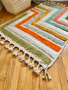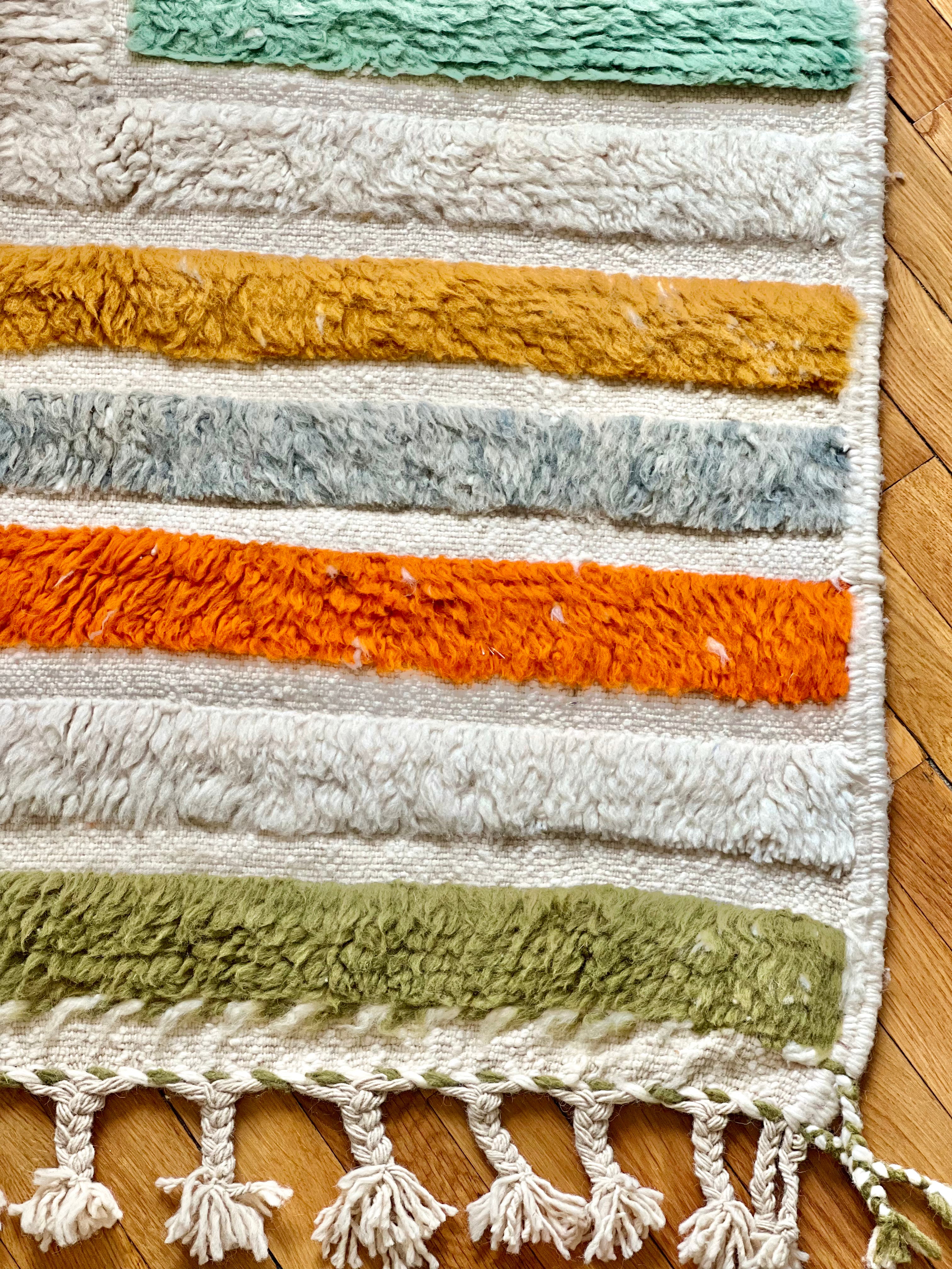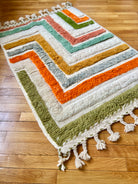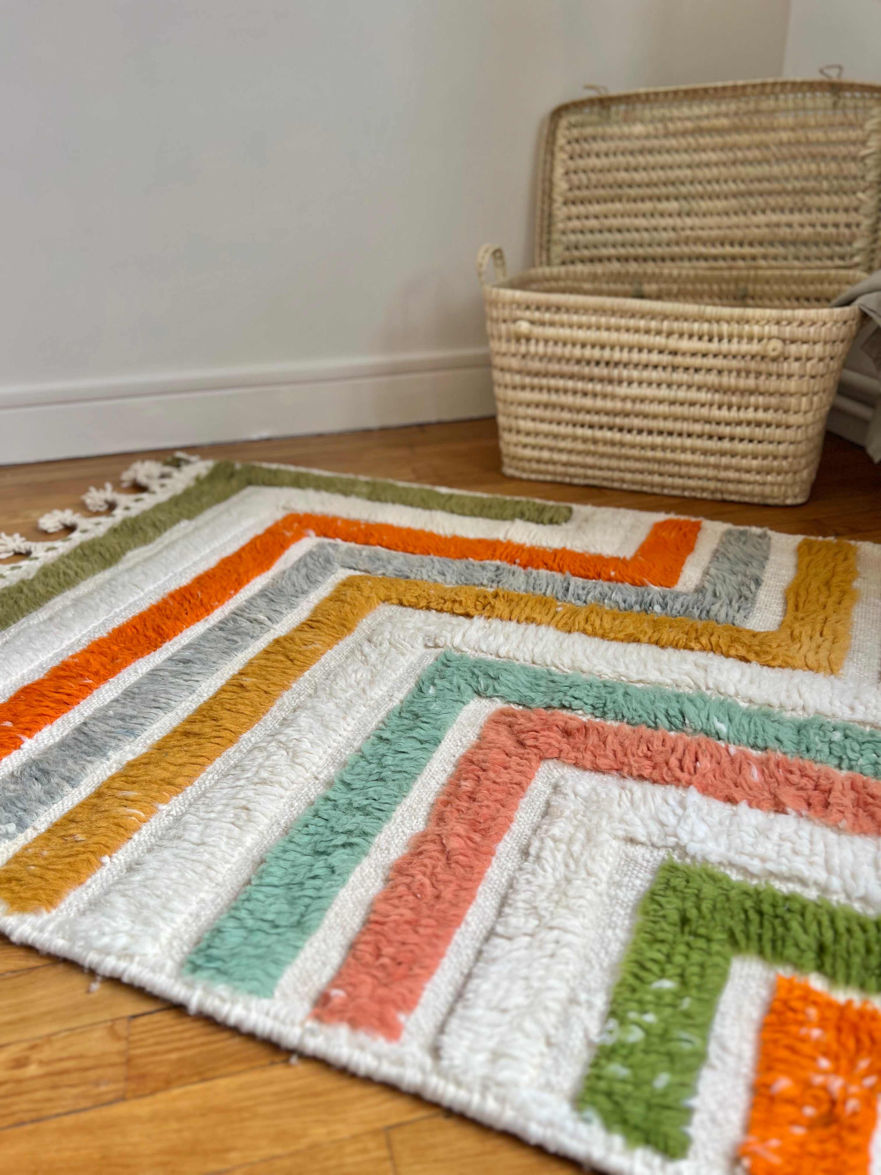 Le tapis Arc en Ciel Nomade est une véritable explosion de couleurs dans l’univers des tapis berbères. Tissé à la main en laine naturelle, il se distingue par ses bandes en relief aux teintes vives et chaleureuses : vert tendre, orange brûlé, ocre doré, bleu ciel et rose corail.