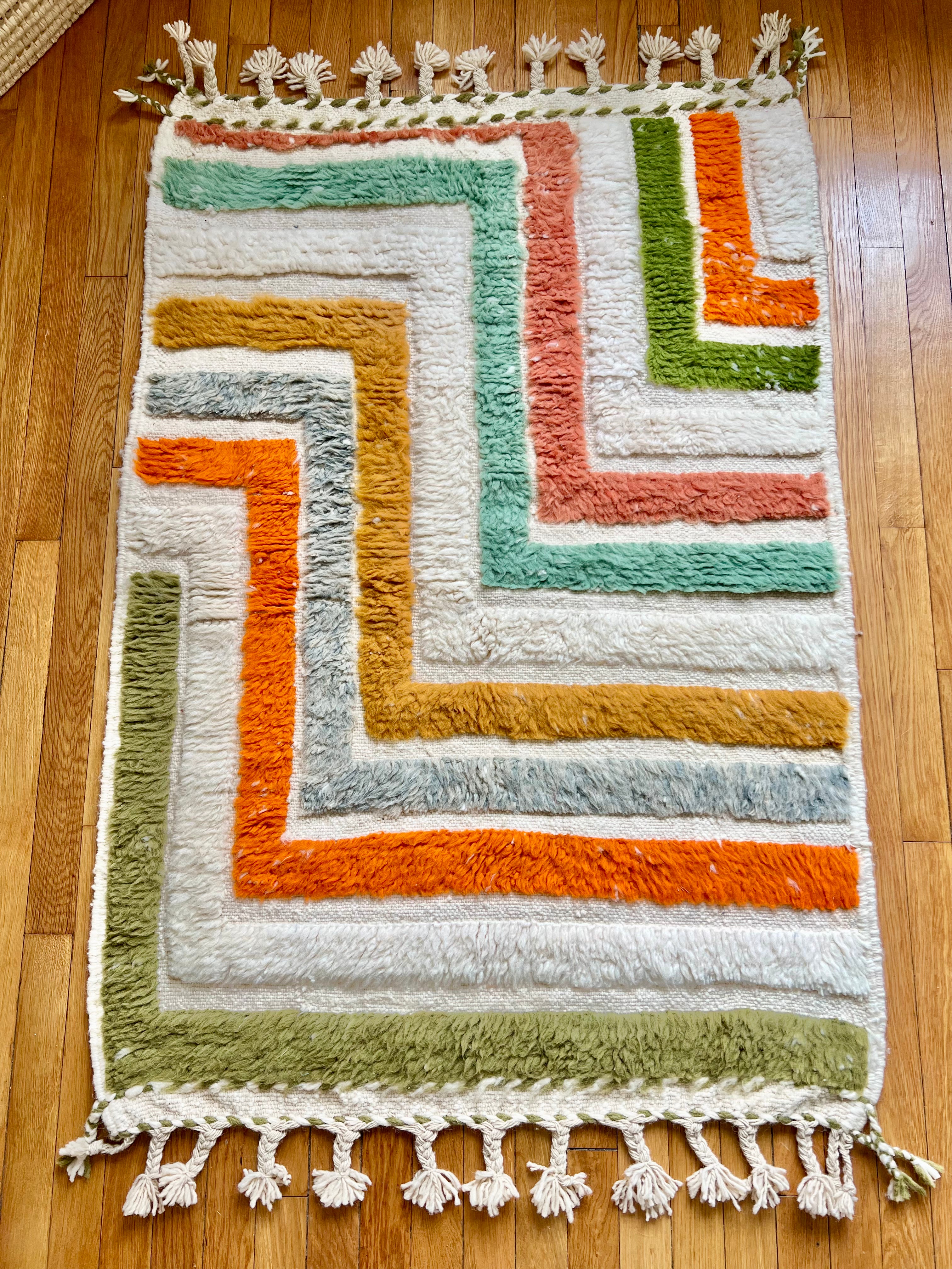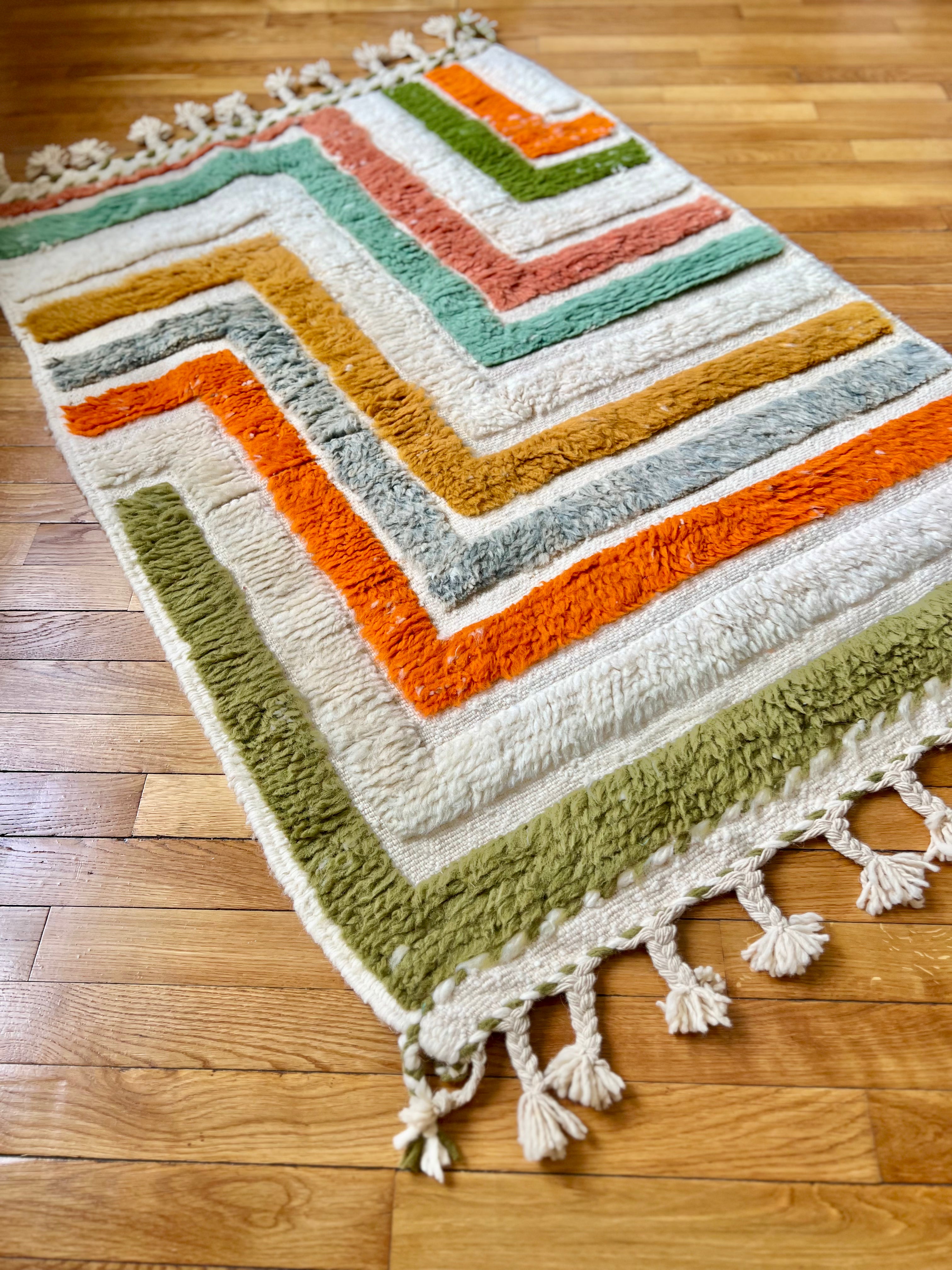 Son motif en chevrons successifs évoque un mouvement nomade, une marche colorée qui illumine l’espace. À la fois confortable et audacieux, ce tapis insuffle énergie et originalité dans un salon, une chambre ou un bureau. Chaque détail, des reliefs à la finition à franges, témoigne d’un travail artisanal minutieux.