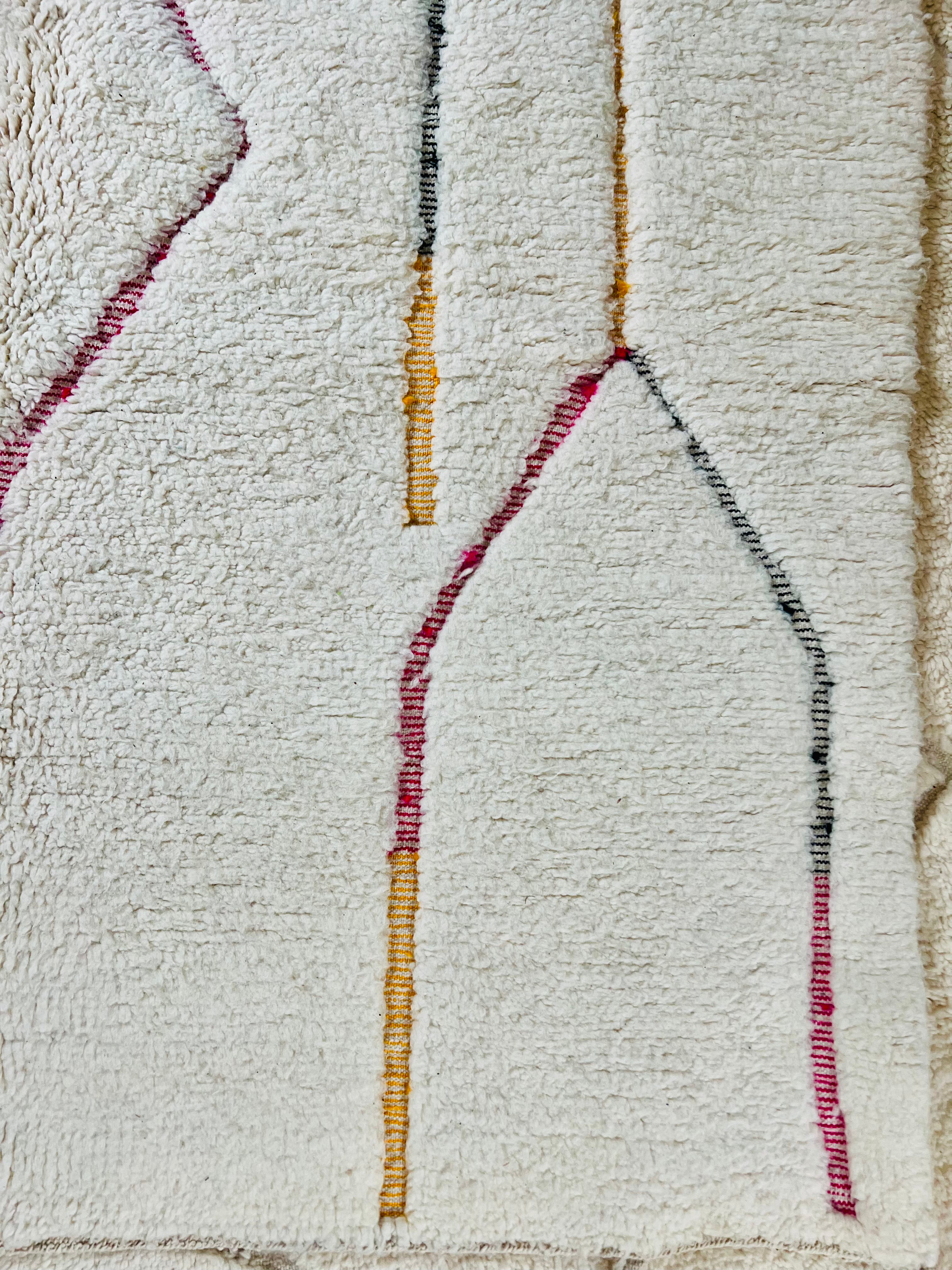 Le tapis berbère Béni Ouarain Notes Safranées est une création artisanale unique, entièrement tissée à la main par des artisanes du Moyen Atlas au Maroc. Inspiré de l’esthétique intemporelle des tapis berbères traditionnels, il associe un fond blanc crème en laine naturelle à des lignes géométriques modernes aux nuances chaleureuses de safran, rouge grenat et noir profond.