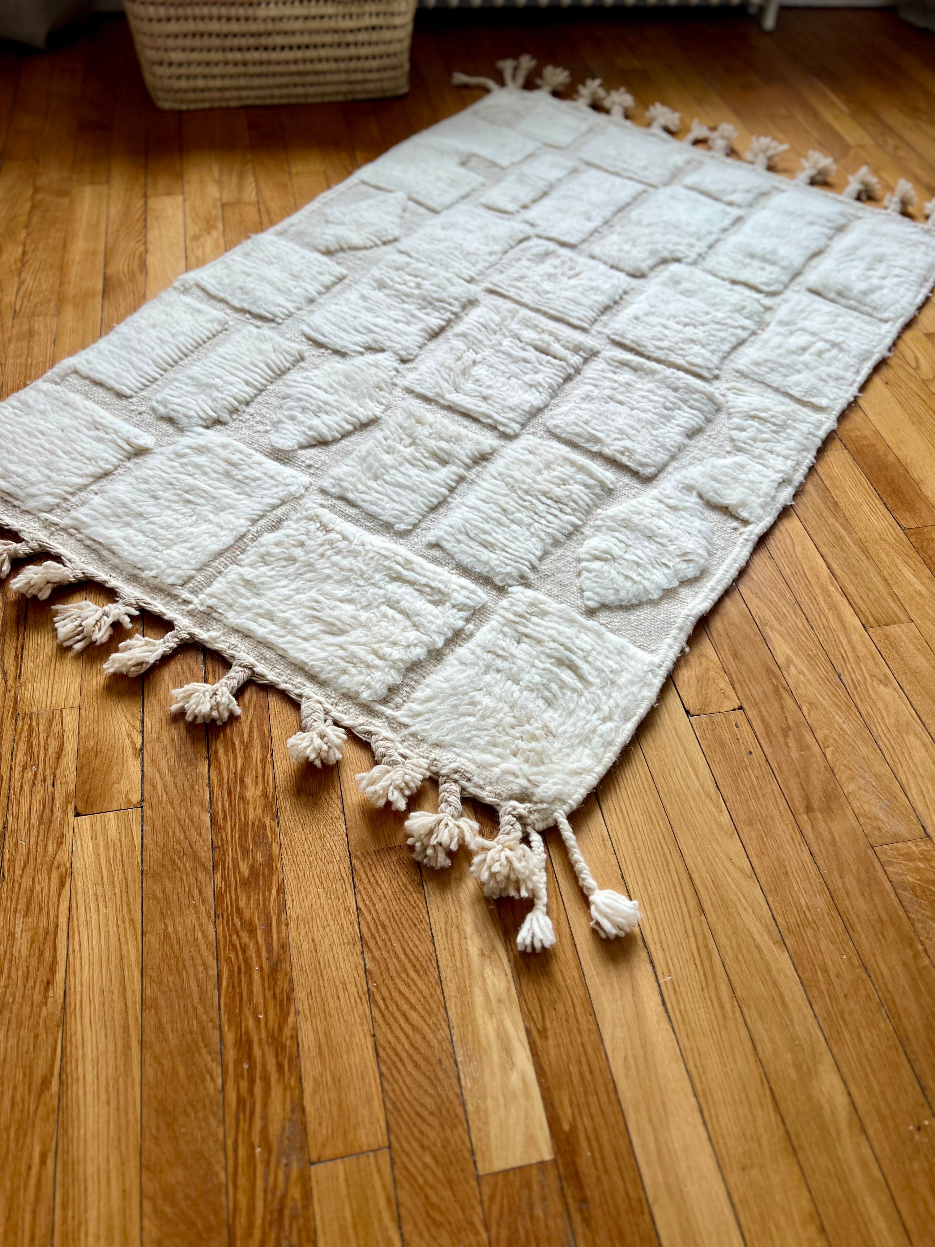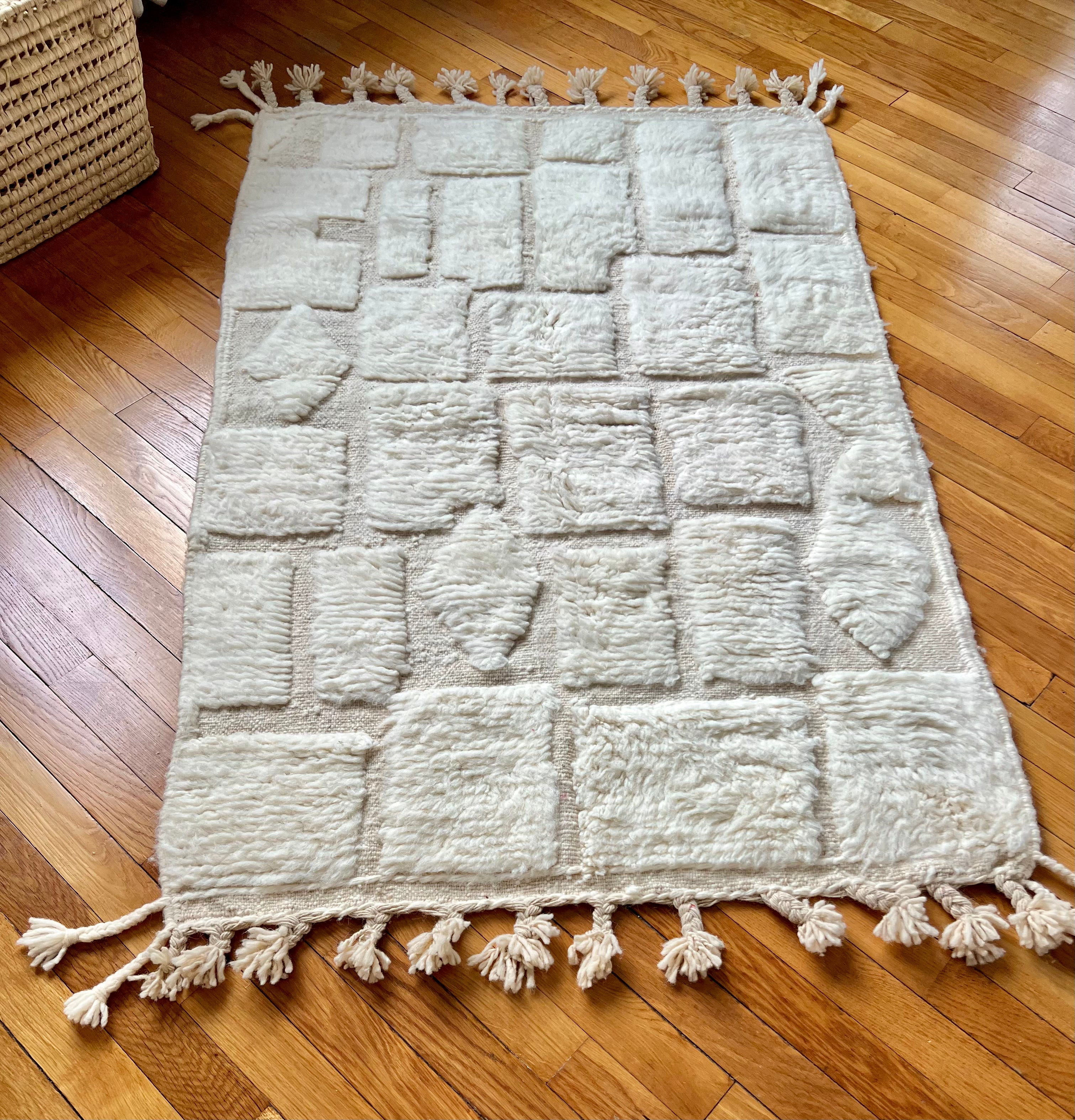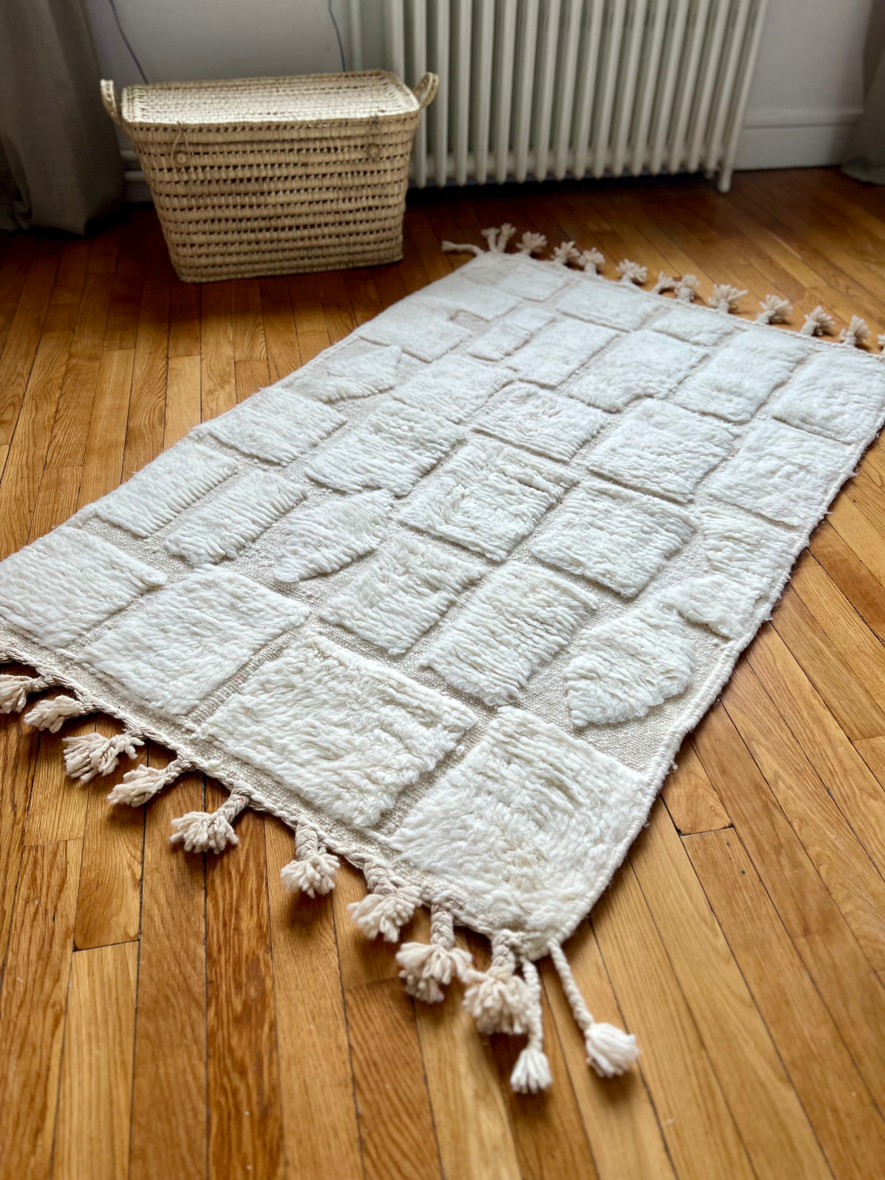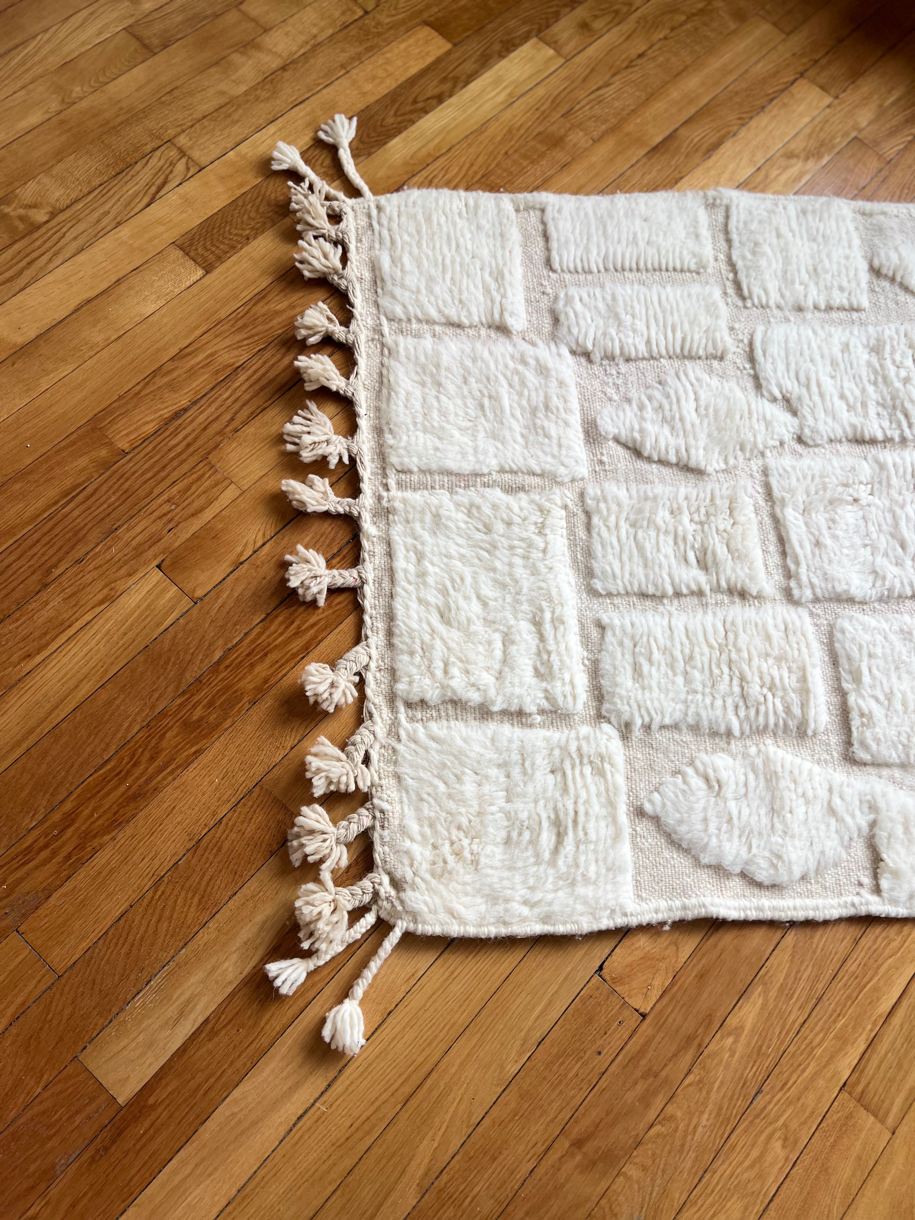 Le tapis Casa Blanca est une pièce artisanale qui joue avec la lumière grâce à ses motifs en relief ton sur ton. Entièrement tissé à la main en laine naturelle, il se compose de carrés et de formes géométriques texturées qui créent un effet graphique subtil et raffiné.