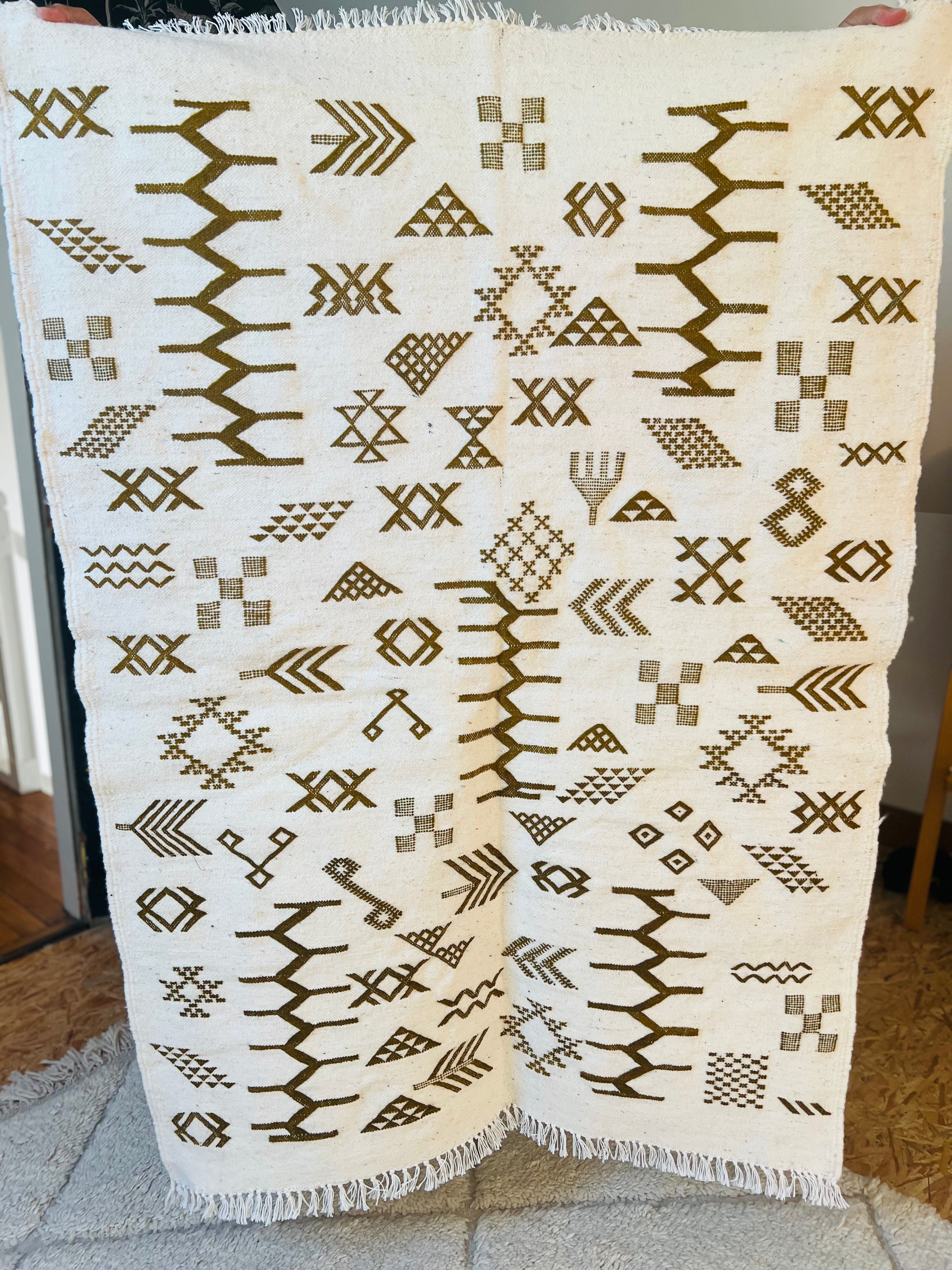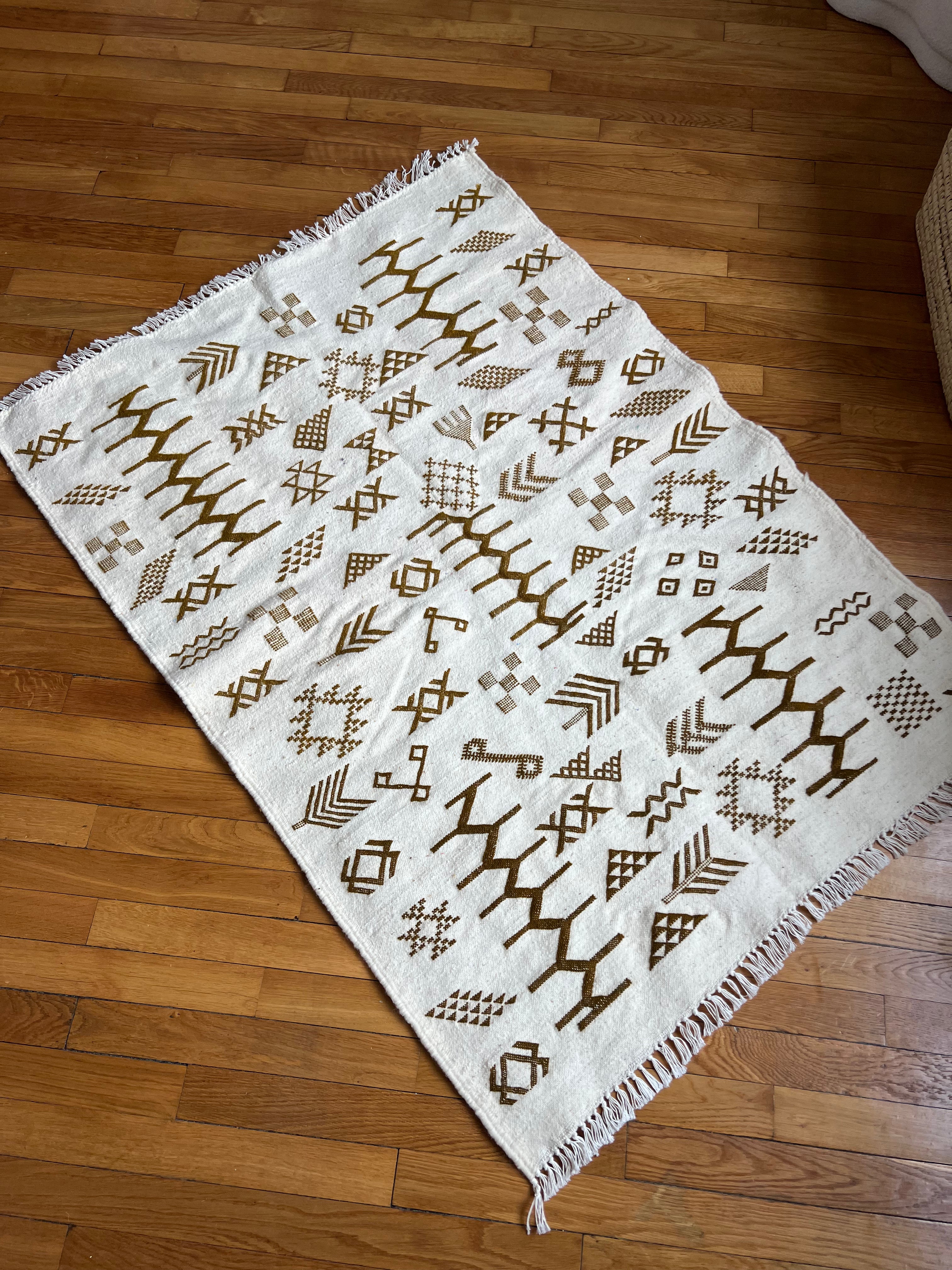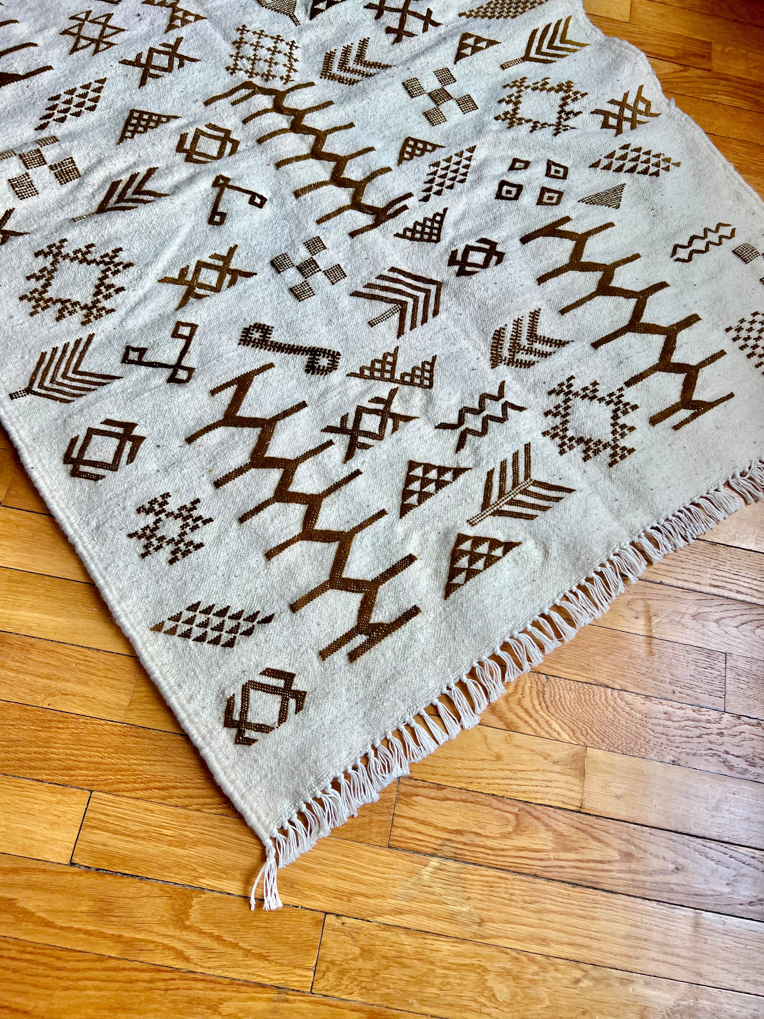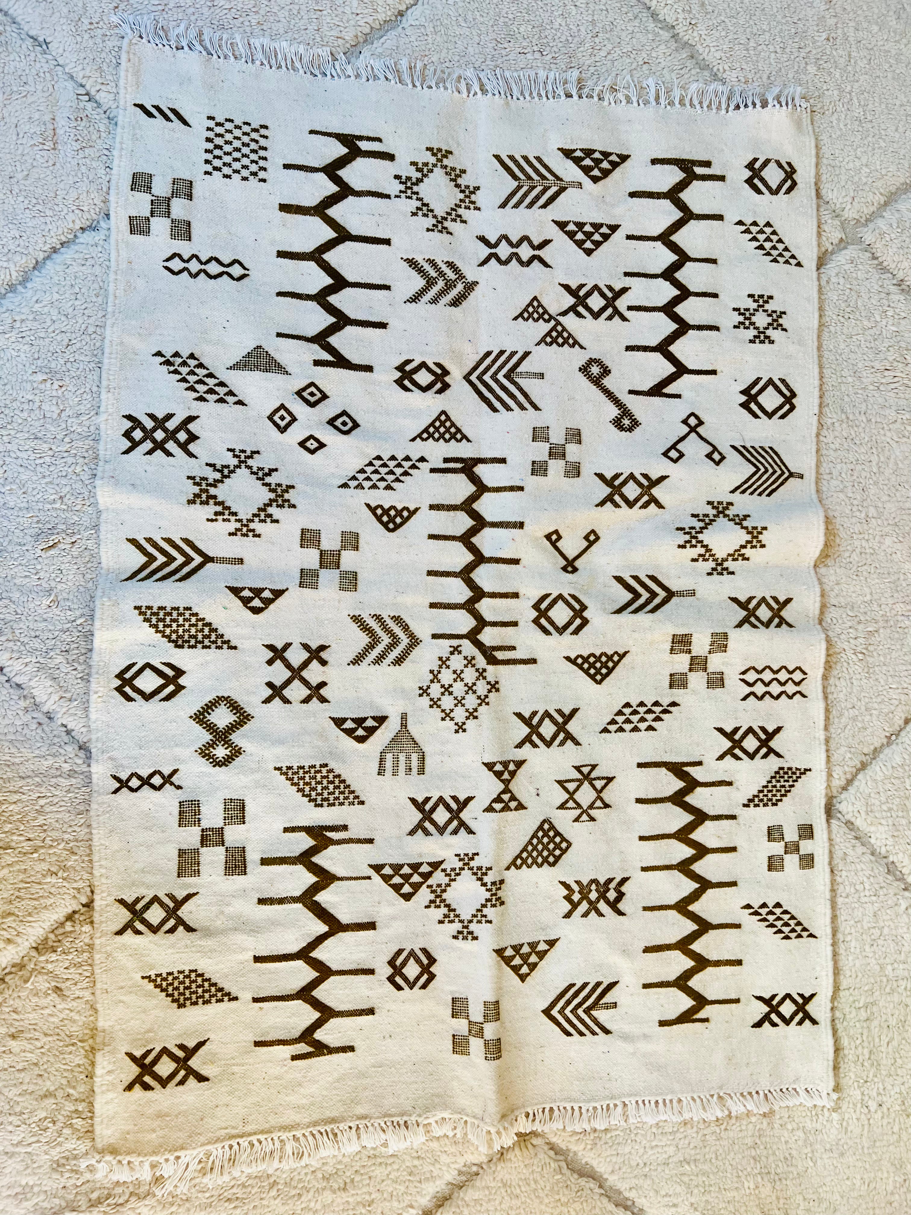 Le tapis Étoile de Kilim est une pièce artisanale qui met à l’honneur les motifs symboliques du tissage marocain. Entièrement tissé à la main en laine naturelle, il se distingue par ses nombreux symboles géométriques brun foncé disposés sur un fond crème.