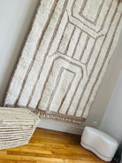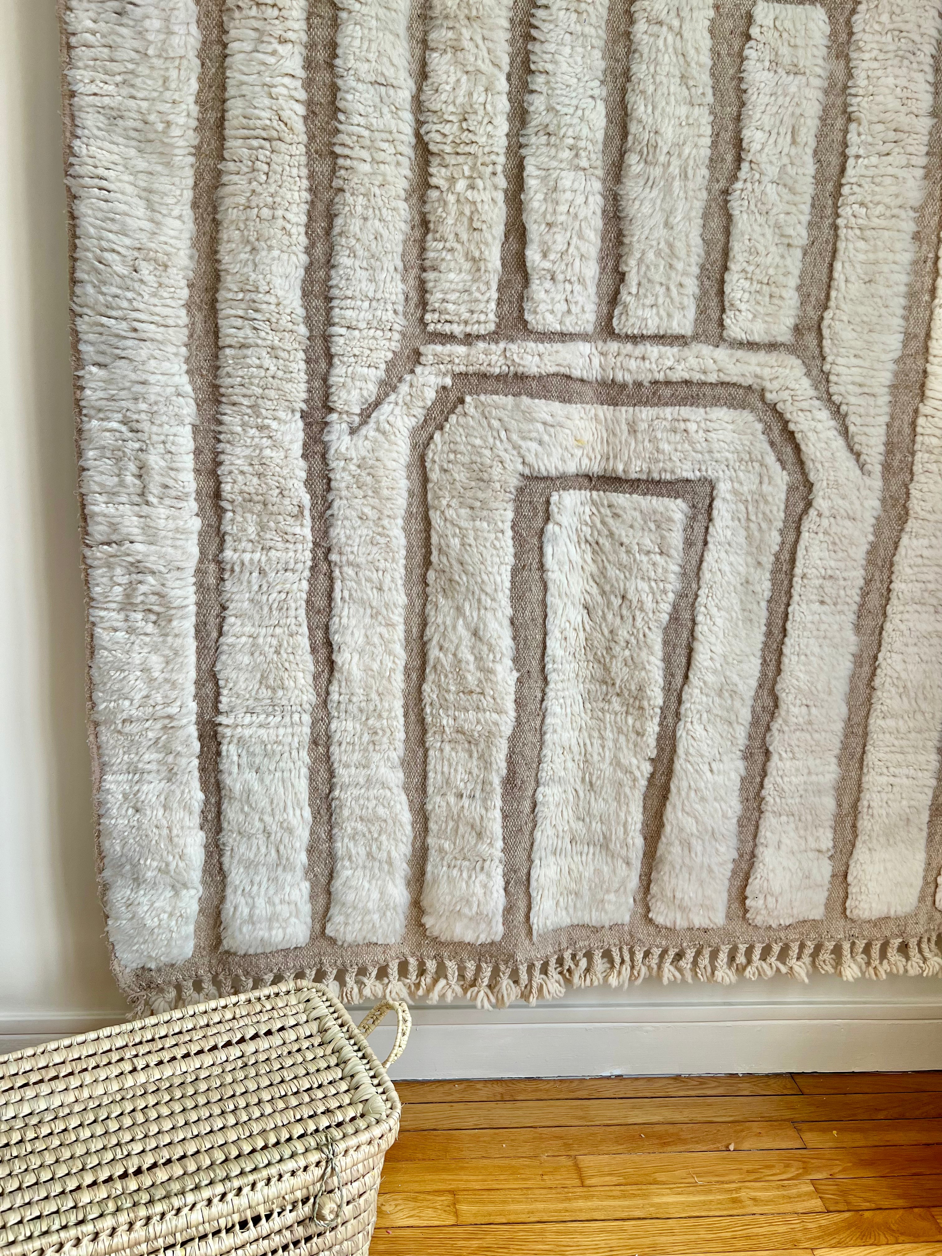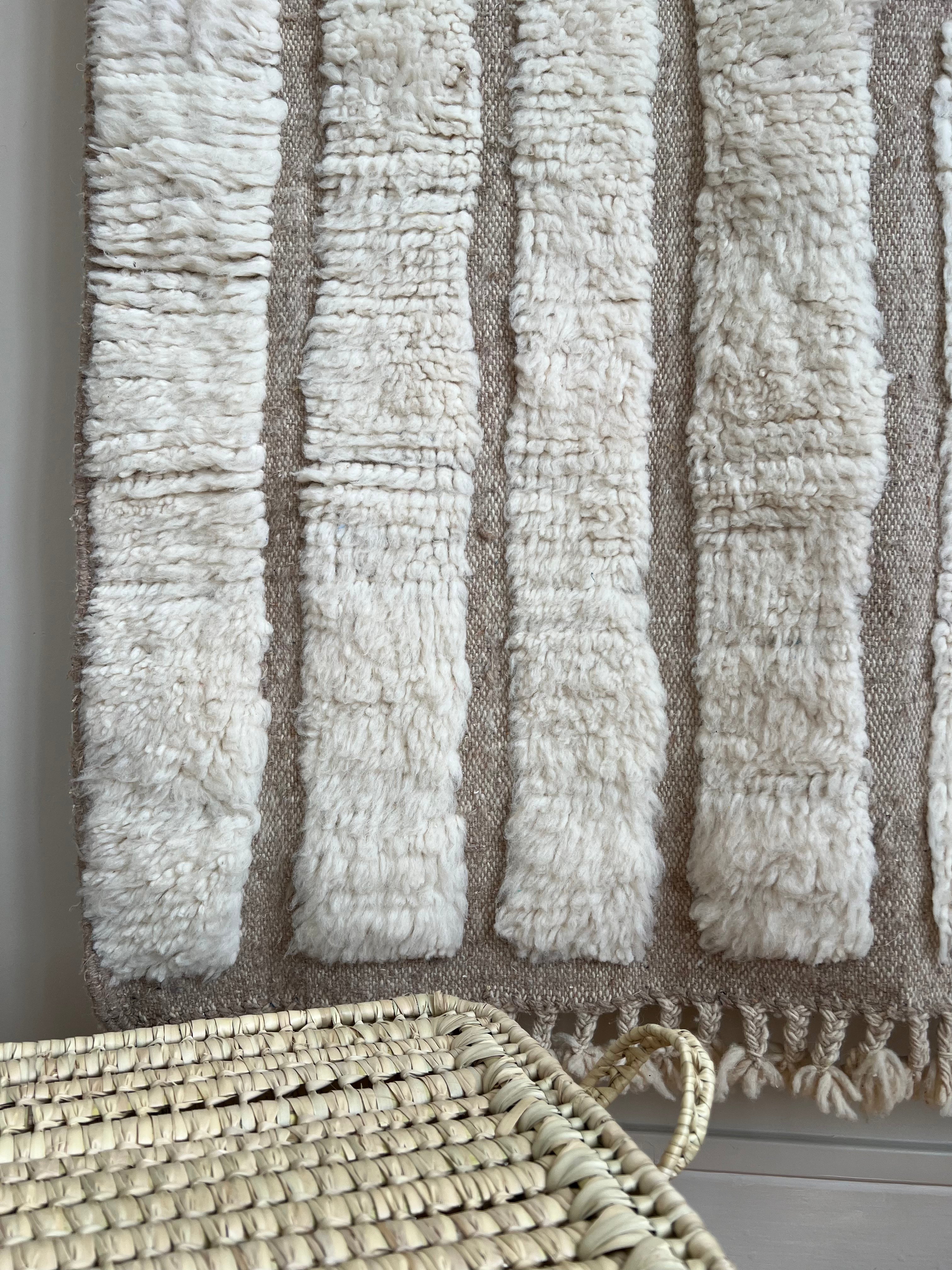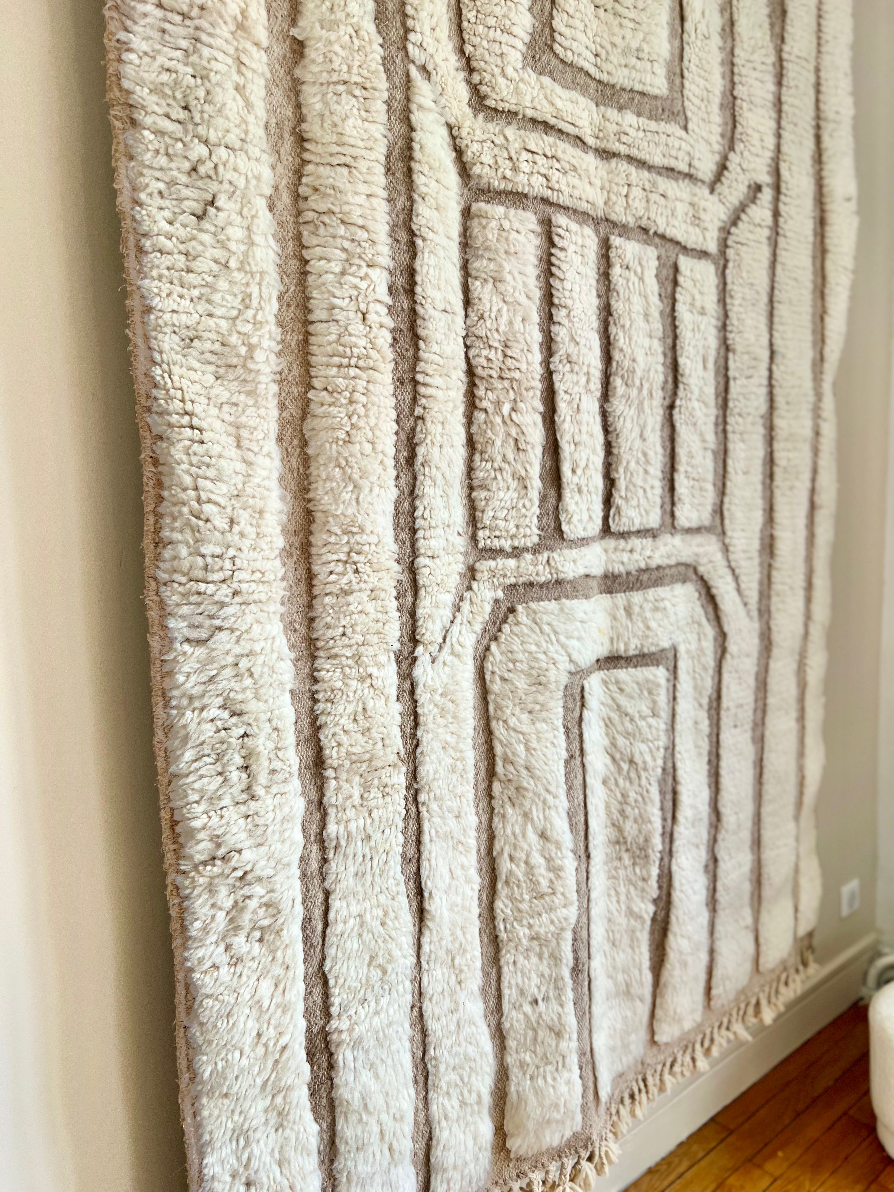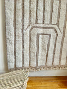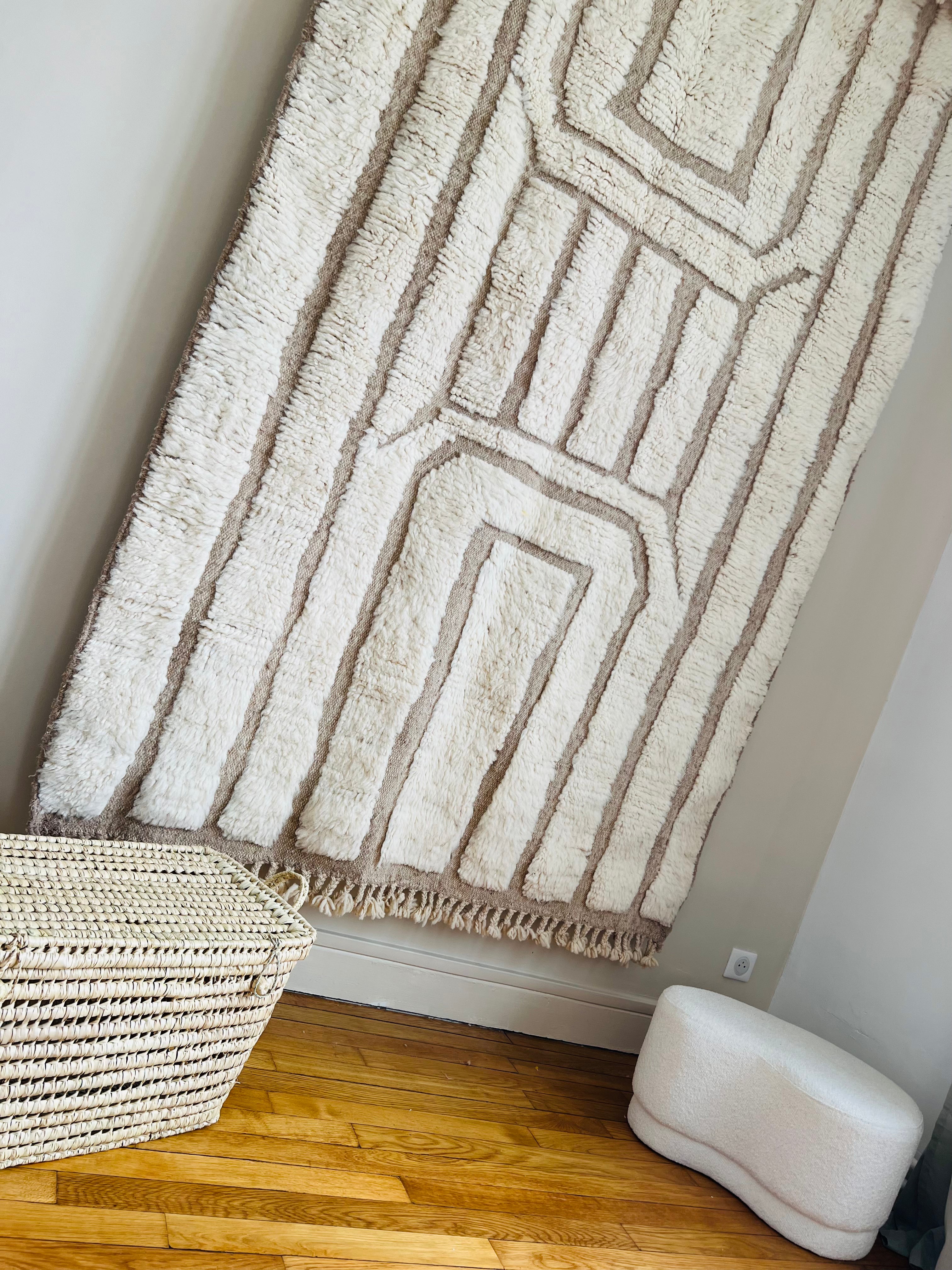 Le tapis Hashtag Nomad est une création artisanale marocaine qui mêle modernité et tradition. Tissé à la main en laine naturelle, il se distingue par ses motifs linéaires en relief, formant un jeu de cadres et de lignes géométriques élégants.