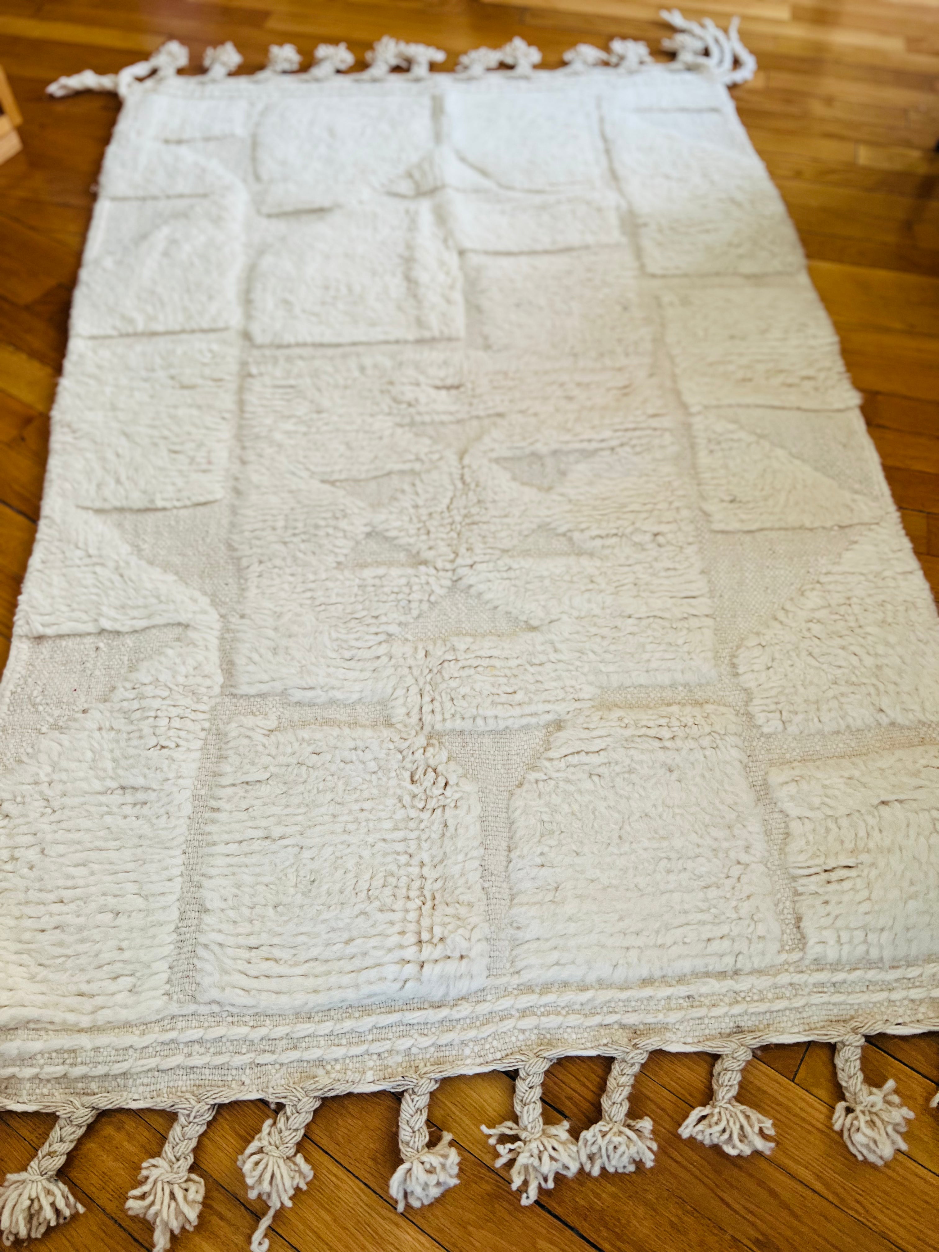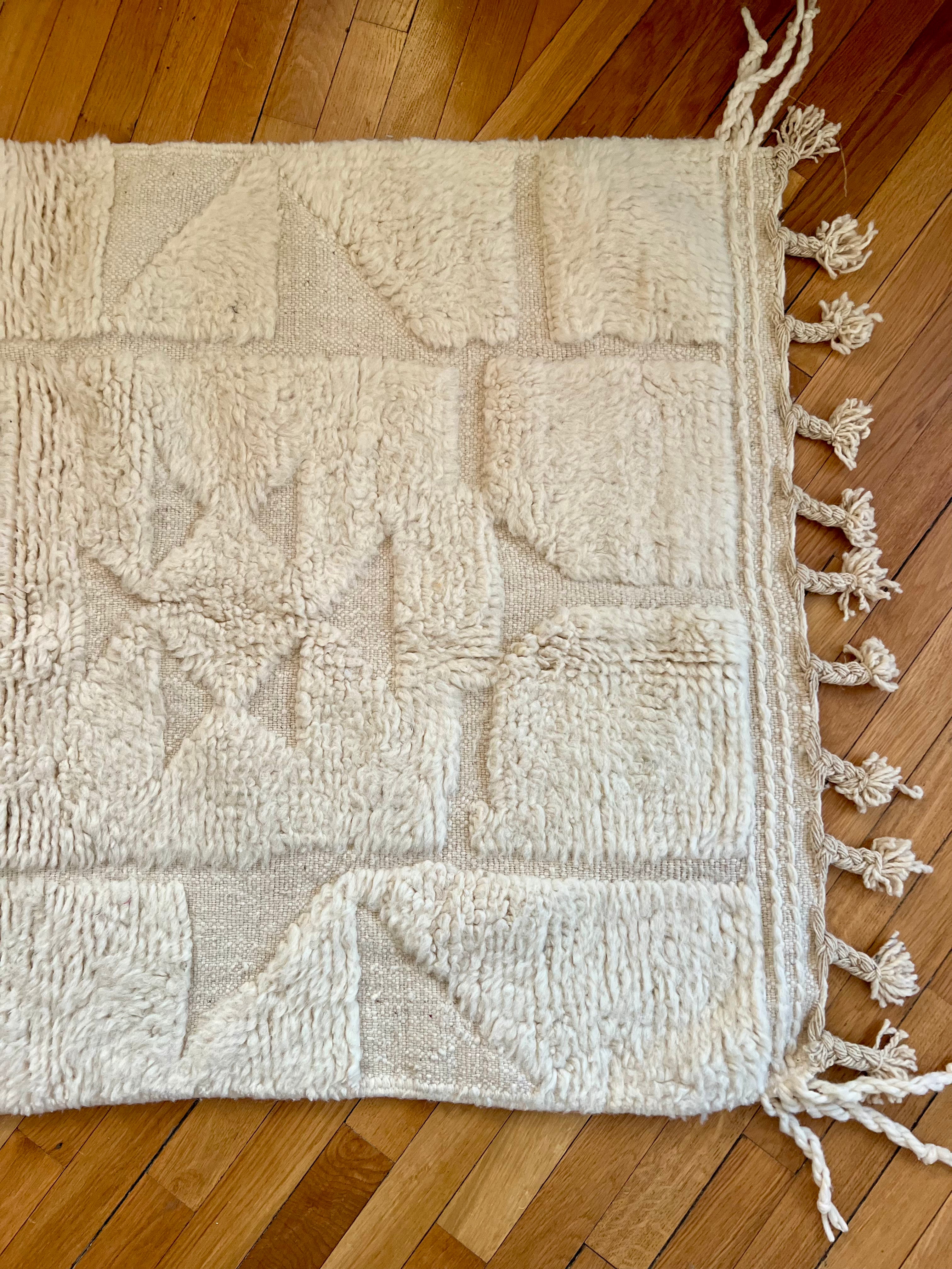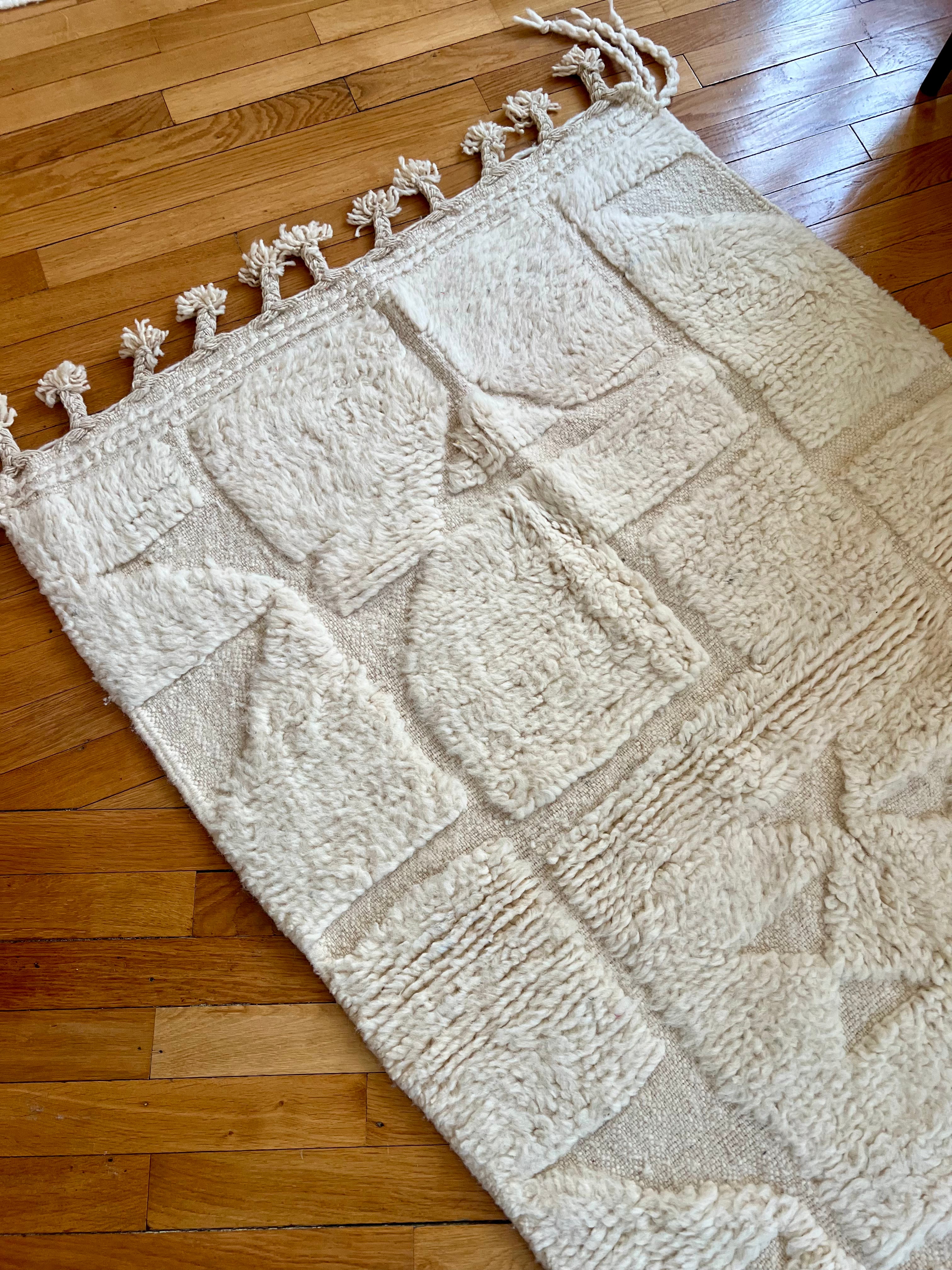 Le tapis Laines Enchantées est une pièce artisanale au charme discret et raffiné. Entièrement tissé à la main en laine naturelle, il présente un fond crème orné de reliefs géométriques, parmi lesquels une étoile centrale qui capte immédiatement le regard.