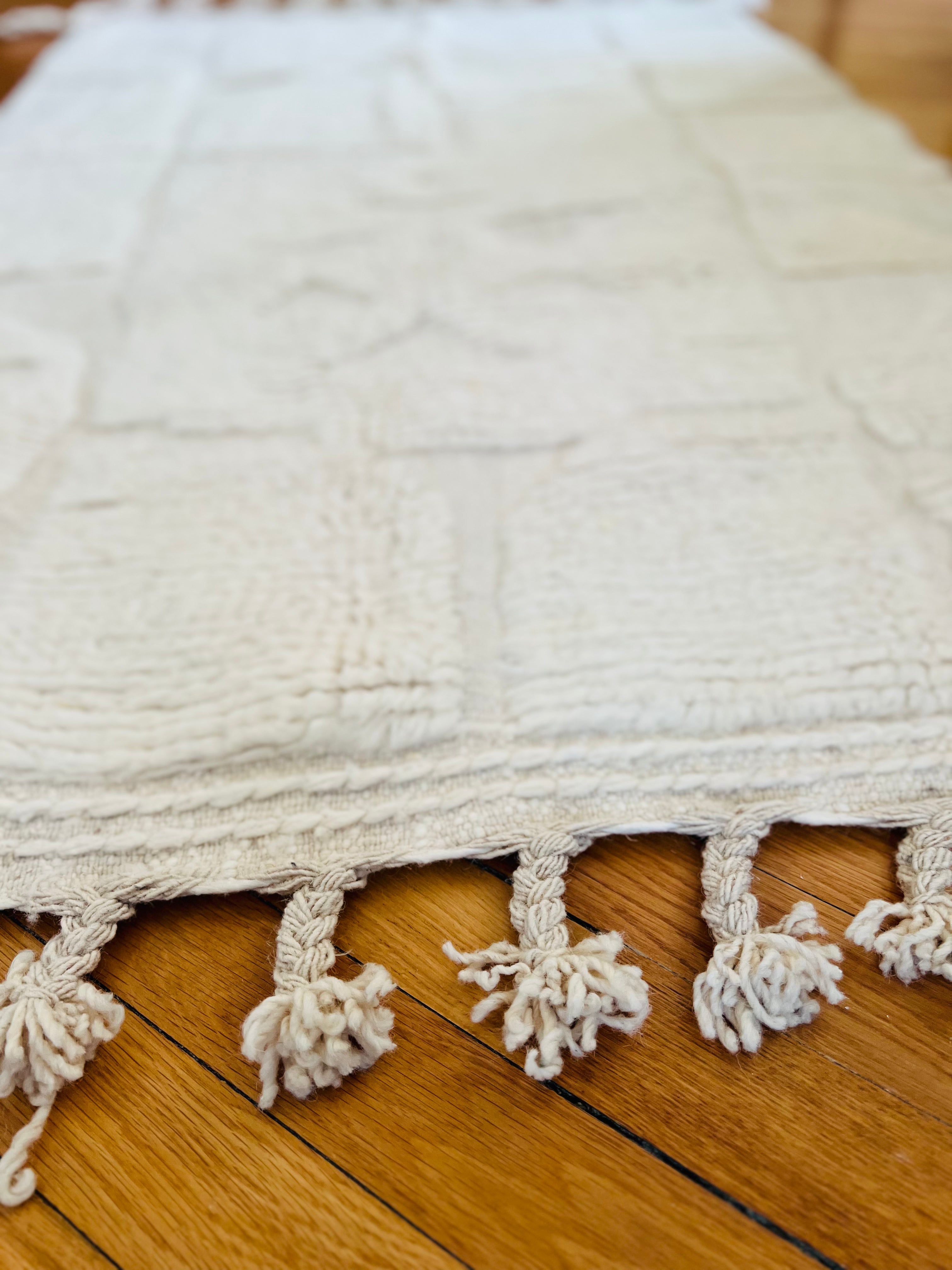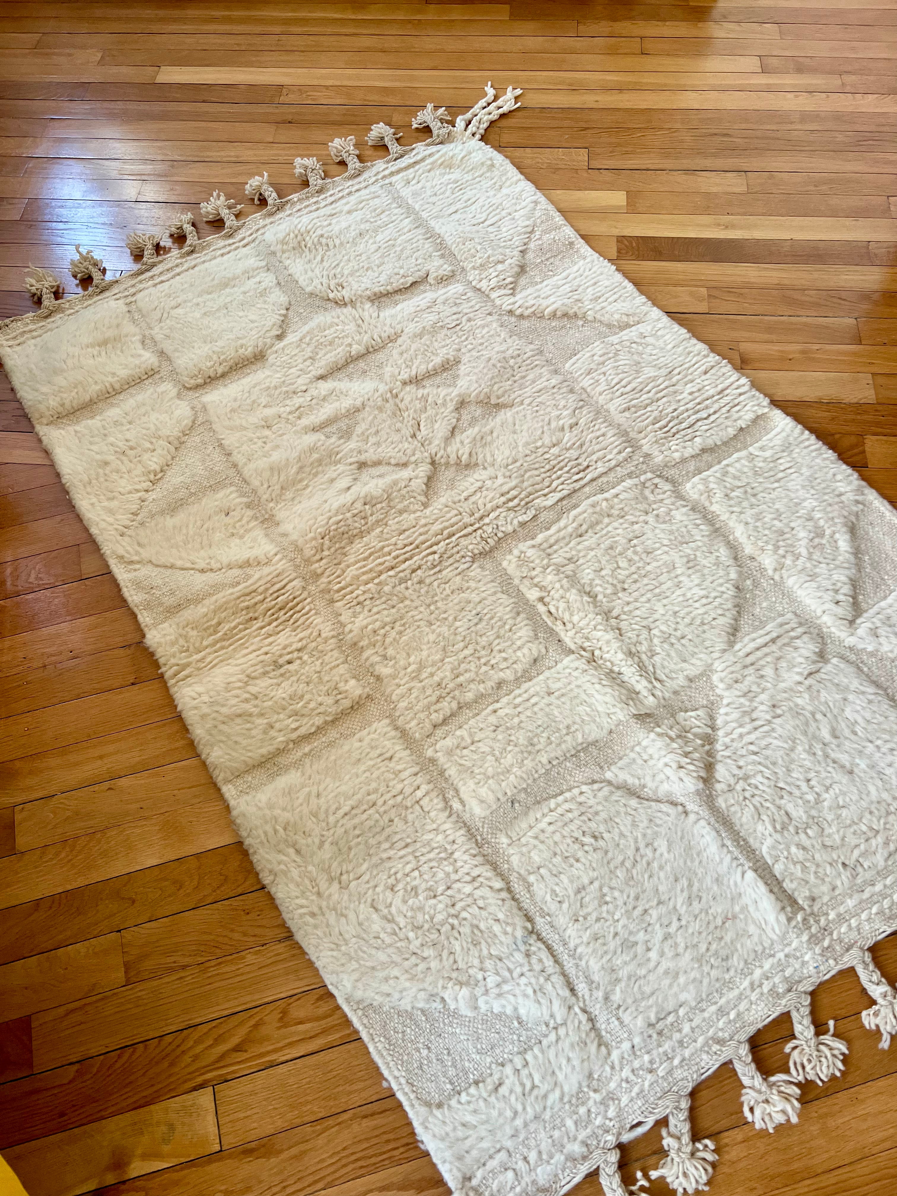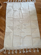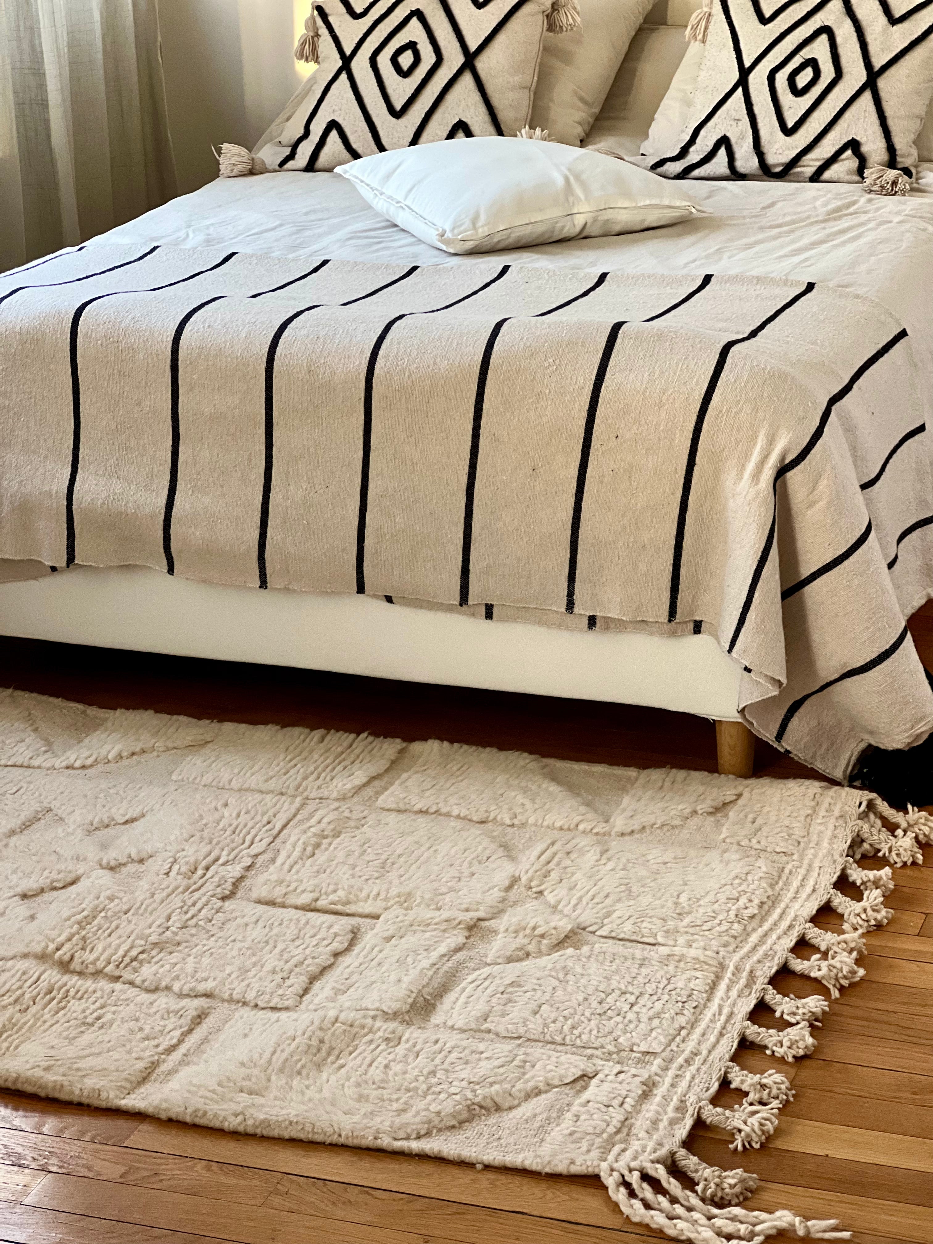 Le tapis Laines Enchantées est une pièce artisanale au charme discret et raffiné. Entièrement tissé à la main en laine naturelle, il présente un fond crème orné de reliefs géométriques, parmi lesquels une étoile centrale qui capte immédiatement le regard.