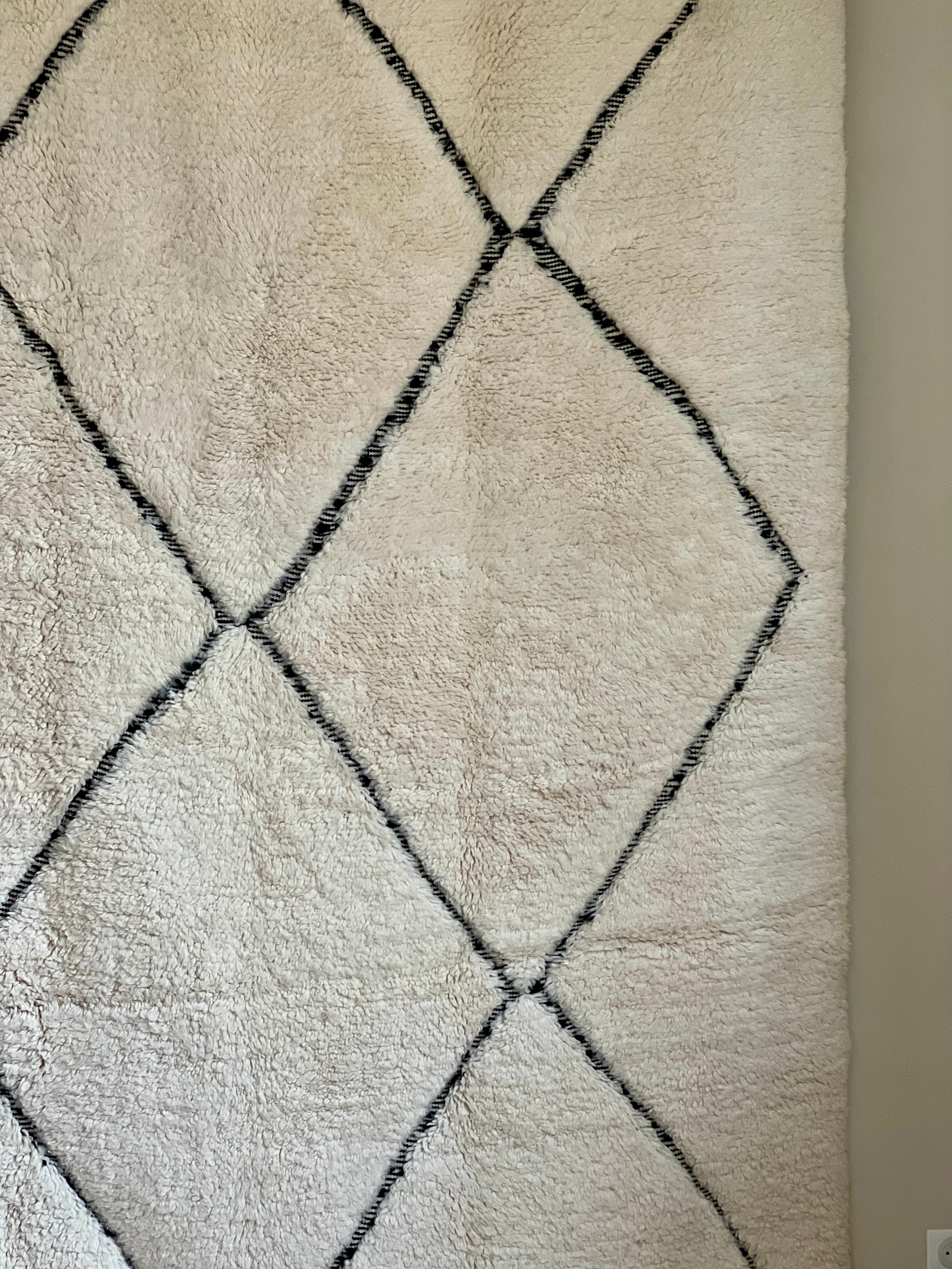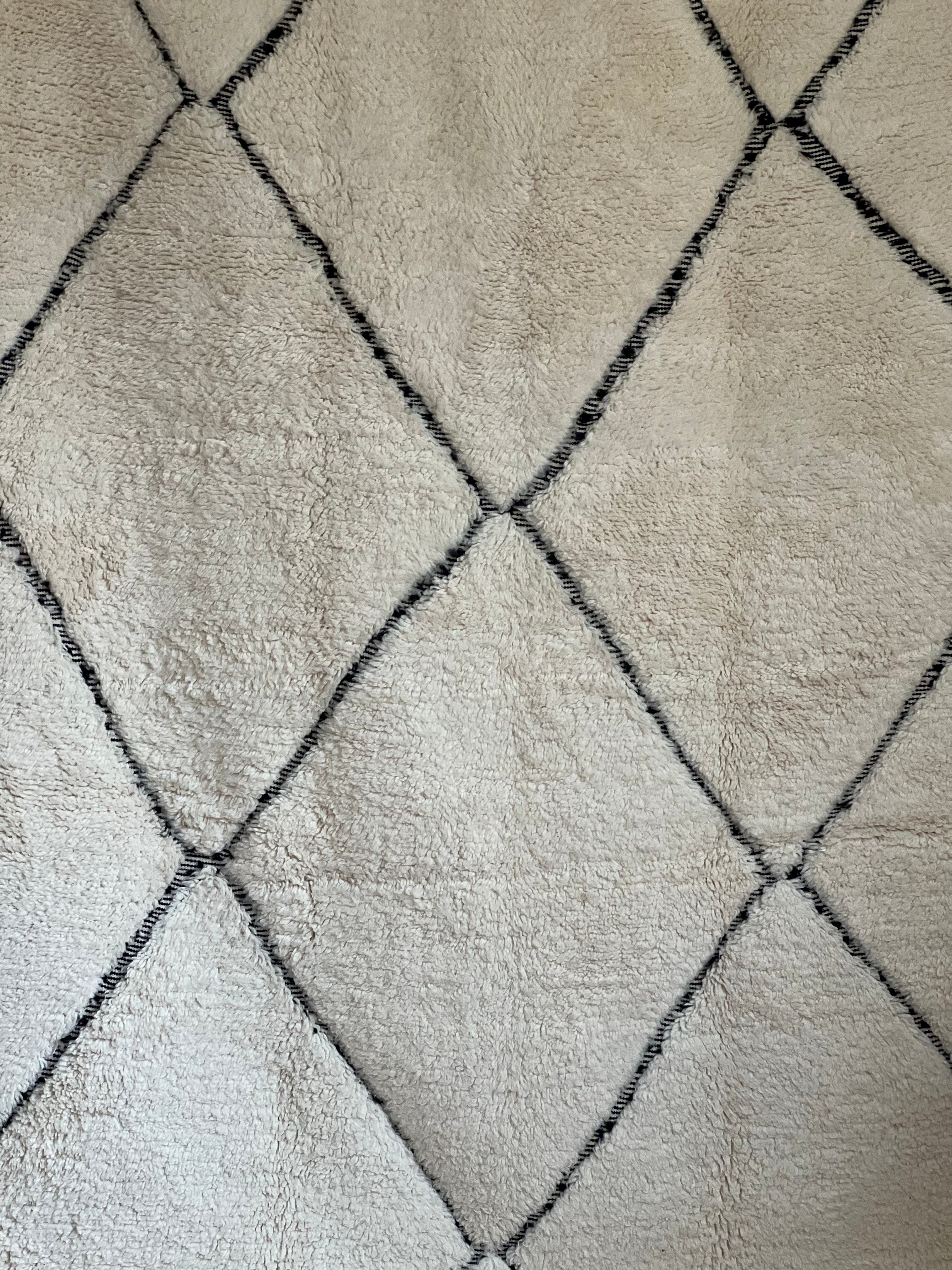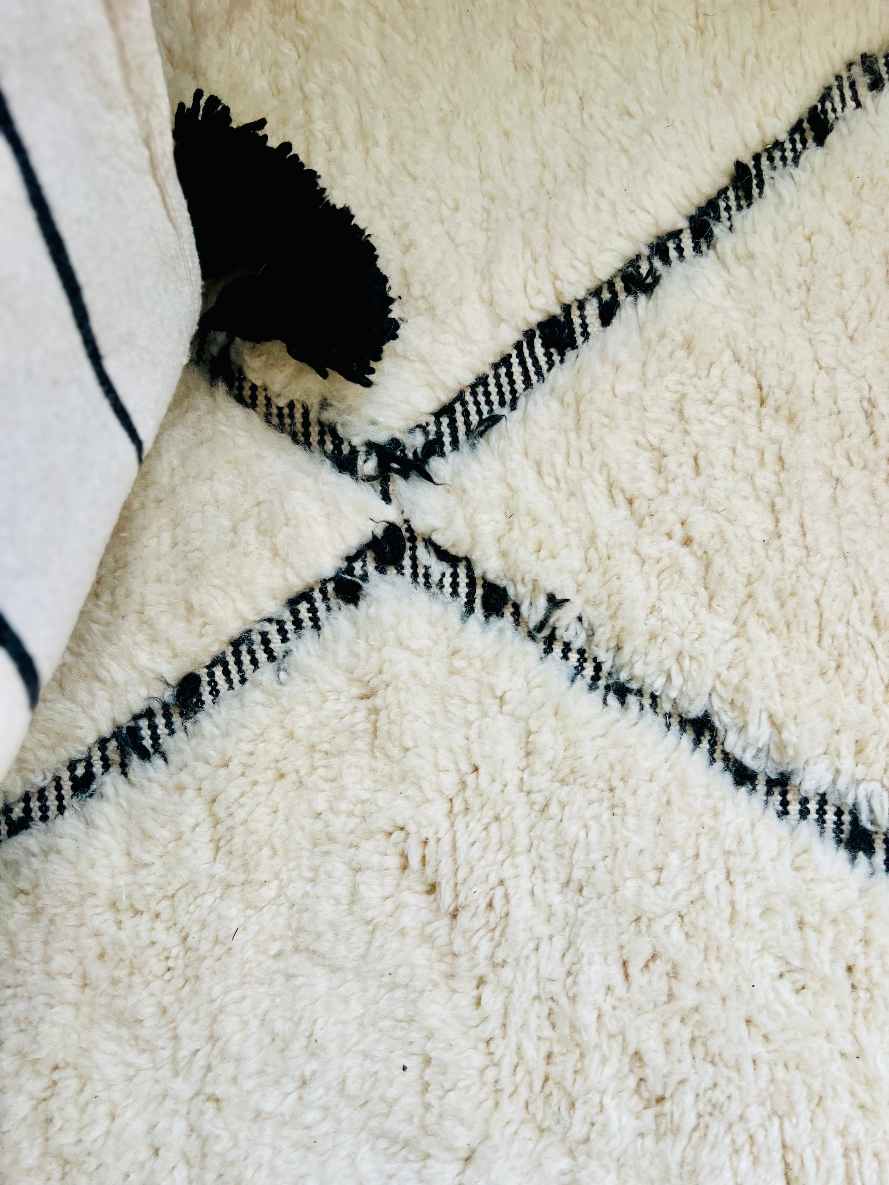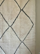 Le tapis Noir sur Blanc incarne l’essence même du style Béni Ouarain : un fond laineux blanc-crème lumineux, sublimé par de larges losanges noirs tracés à la main.
