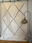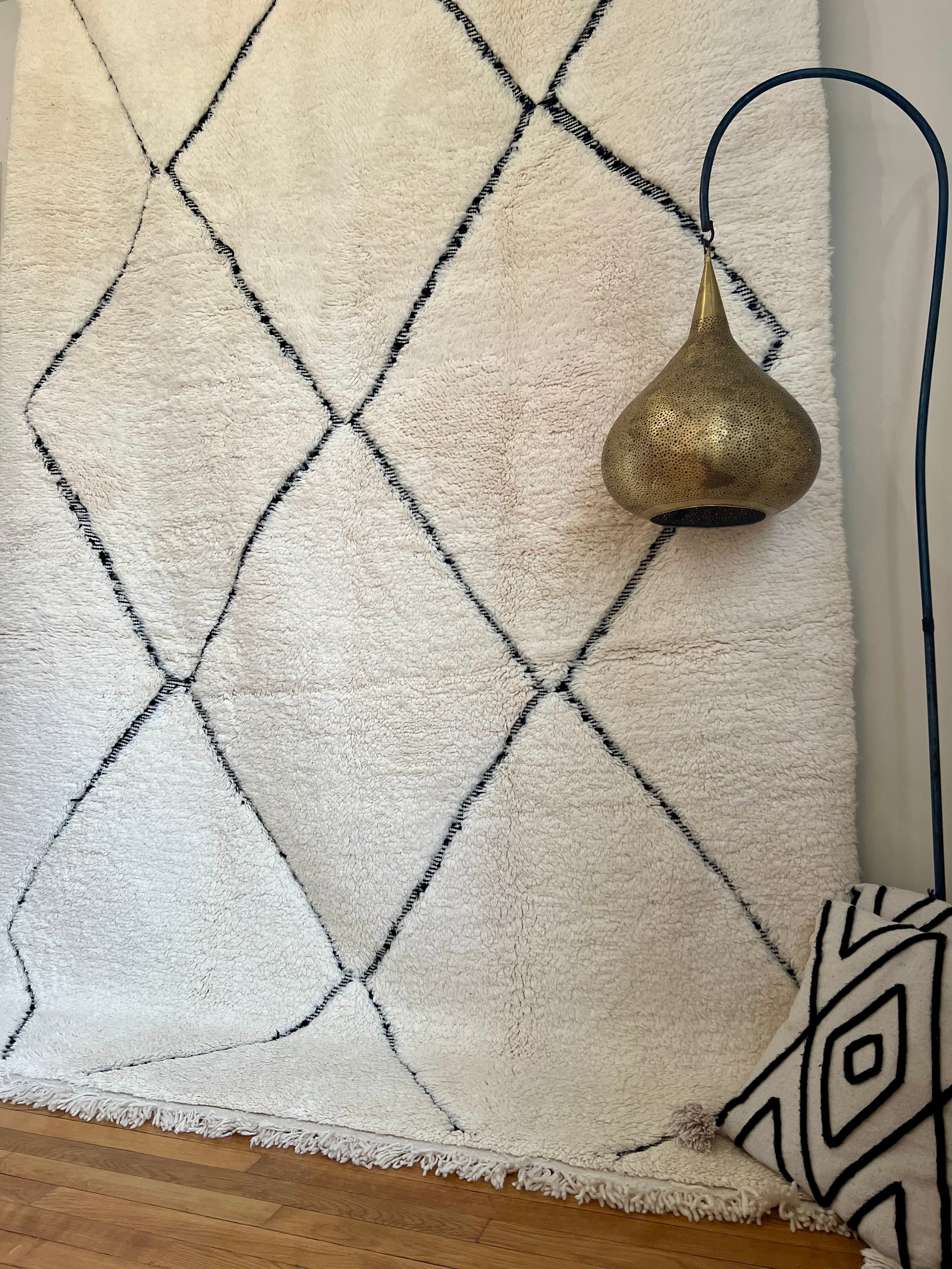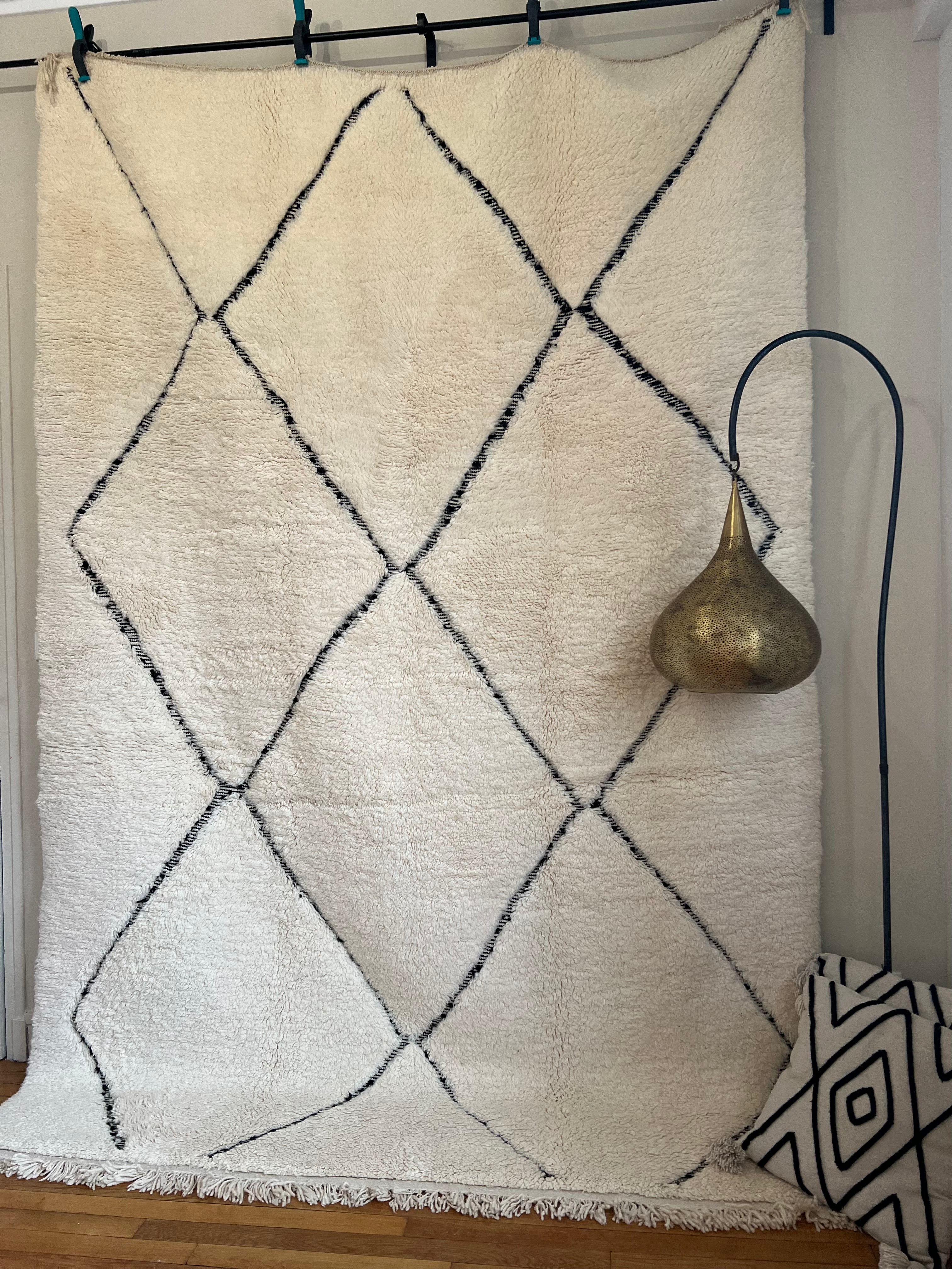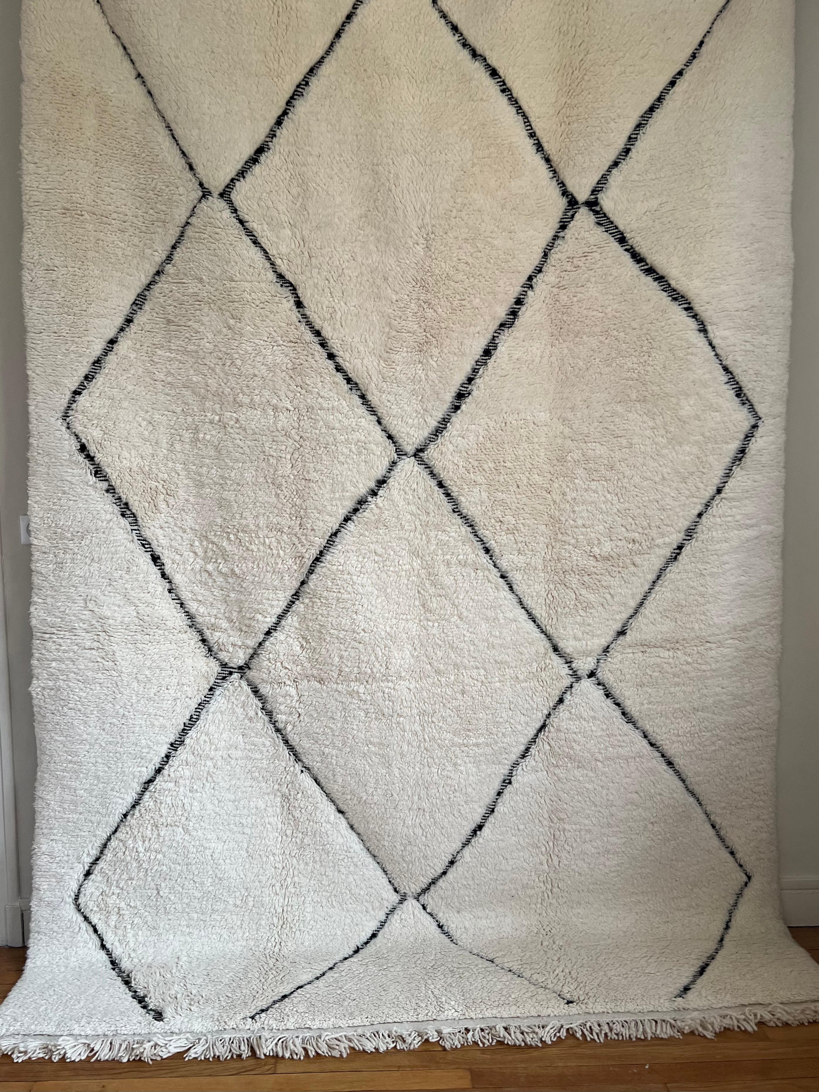 Le tapis Noir sur Blanc incarne l’essence même du style Béni Ouarain : un fond laineux blanc-crème lumineux, sublimé par de larges losanges noirs tracés à la main.